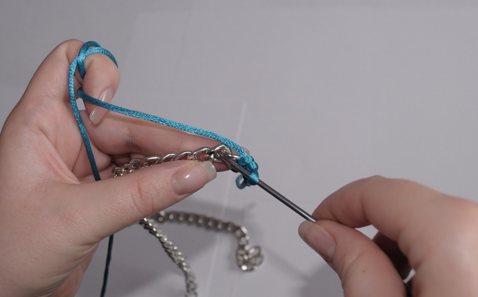 Uhvatite konac i provucite ga kroz lanac kako biste dobile dve omcice na heklici.