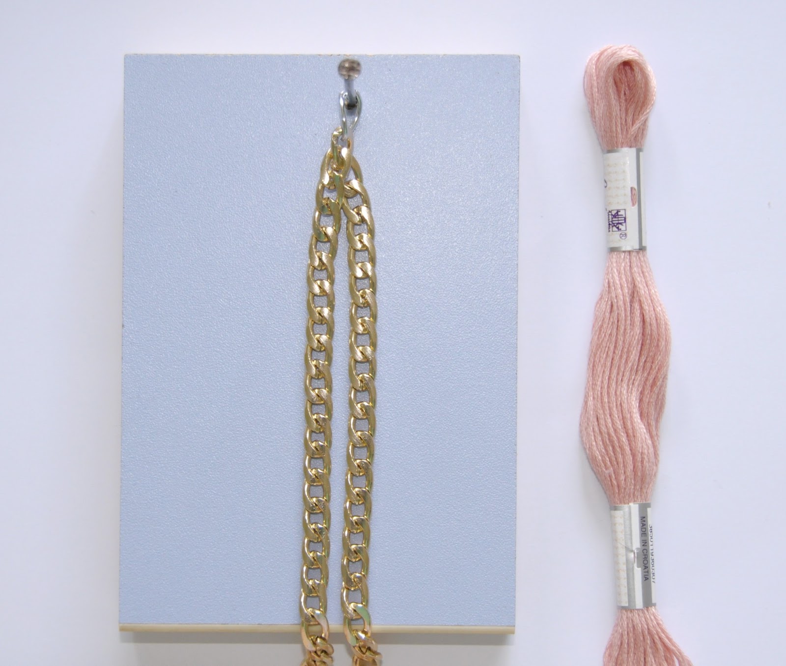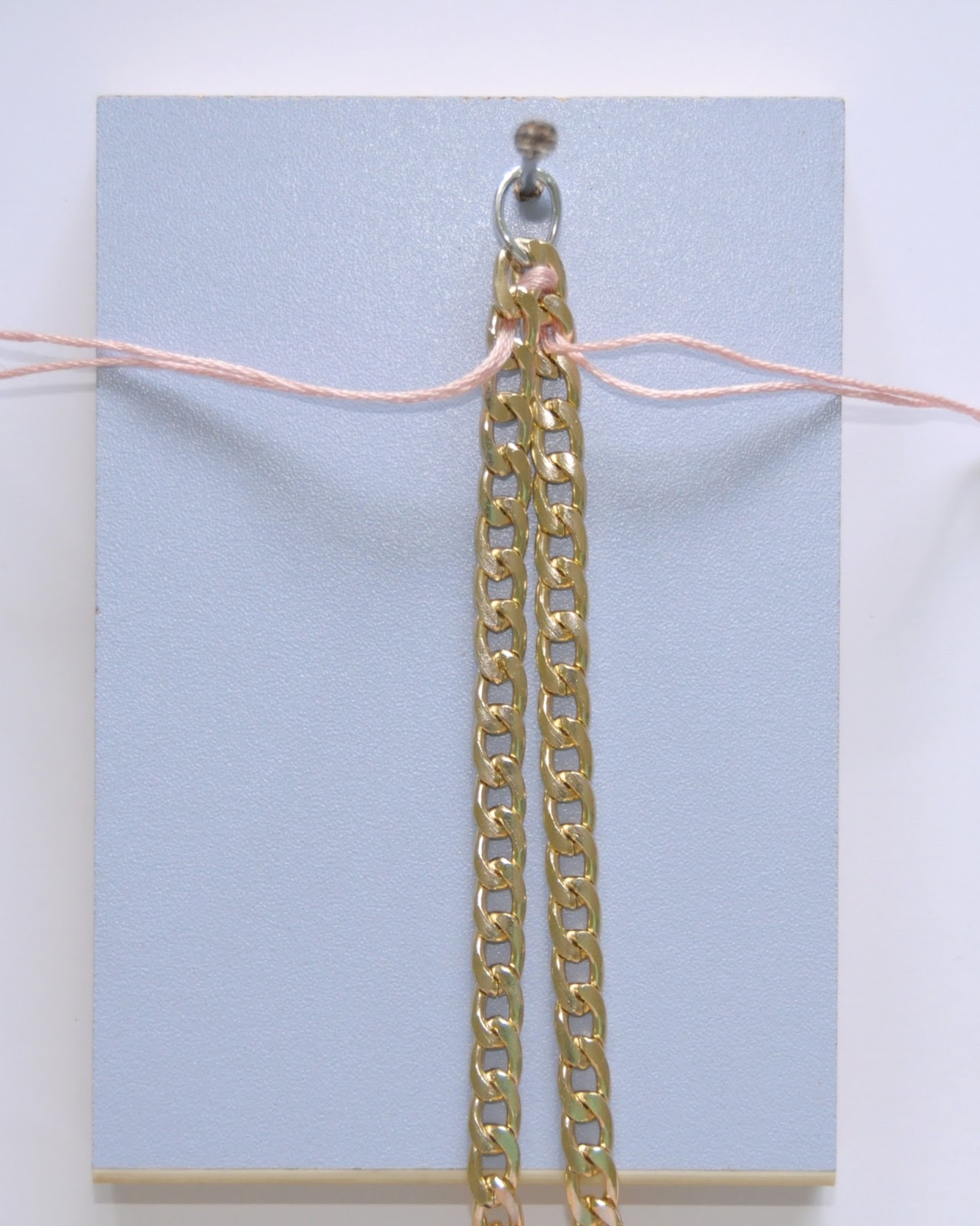 Radi olakšanja posla kada radim sama koristim svoj “izum” (obično parče iverice u koje sam zakucala ekser). Alku koju ste zakačili na kraju lanaca provucite i ona praktično vrši funkciju početka ogrlice i “držača”. Uzmite ovaj konac, dužina treba da bude nešto veća od lanca. Znači, ako ste uzeli 50cm lanca, neka ovo ude 70cm. Naravno, uzumate duplo, da bi bilo deblje.